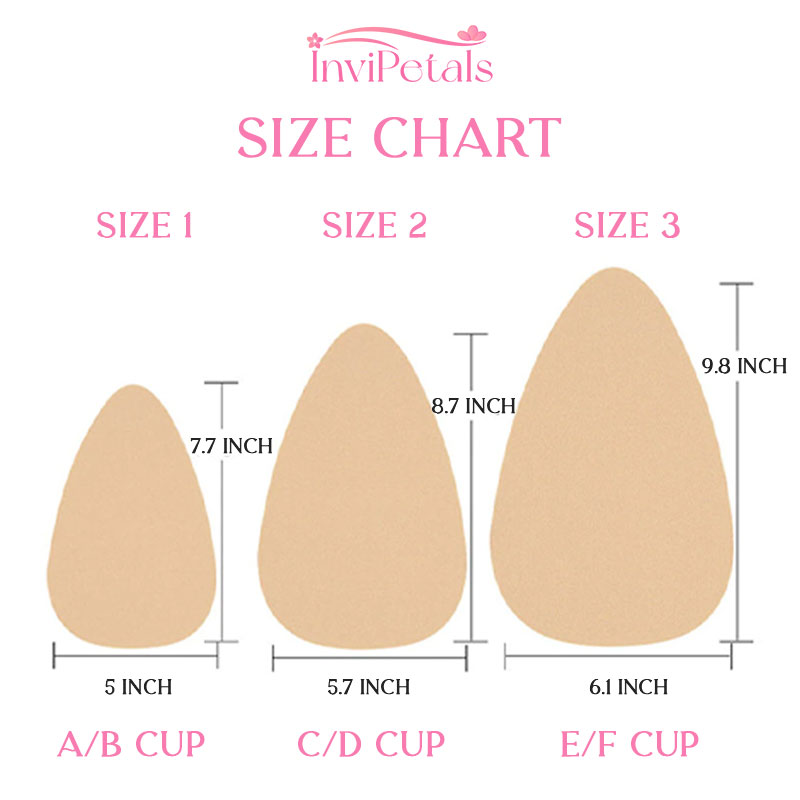 An amazing alternative to strapless bras or push-up bras, InviPetals comes in 3 different sizes that fit any woman with a cup size between A-F!